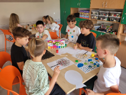- Zajęcia integracyjne: wspólne tworzenie obrazu na dużych brystolach; układy taneczne; burze
